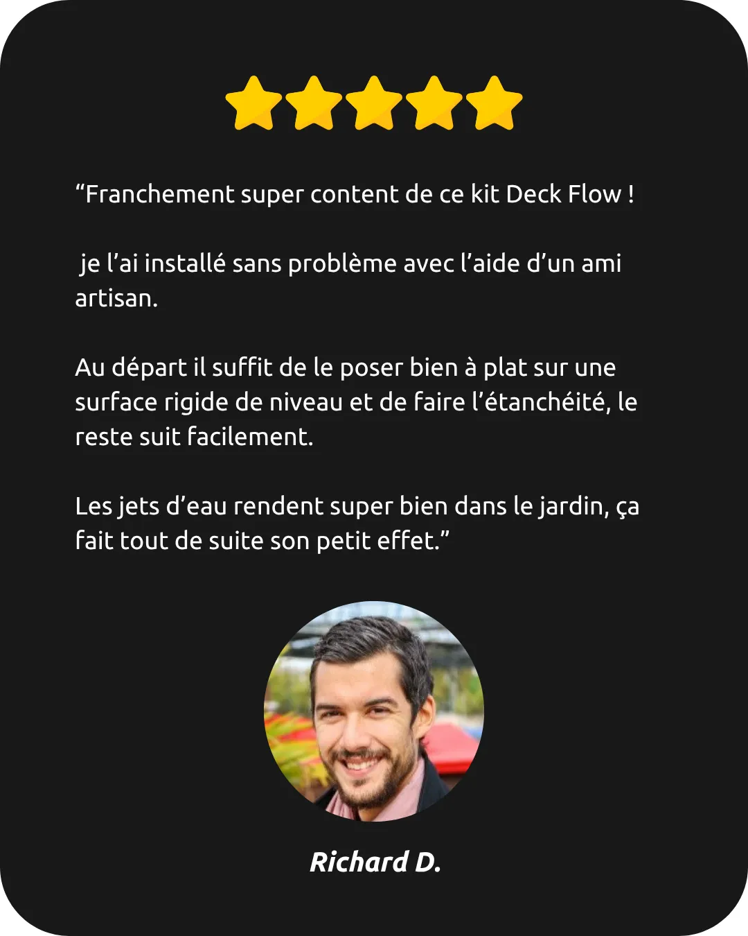 Je n’avais jamais entendu parler de DeckFlow avant de tomber presque par hasard sur le site… et ça a été un vrai coup de cœur : j’ai contacté le vendeur pour connaître les prix et les délais de livraison, et je l’ai commandé aussitôt.